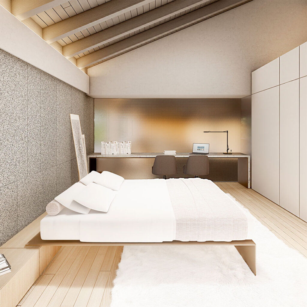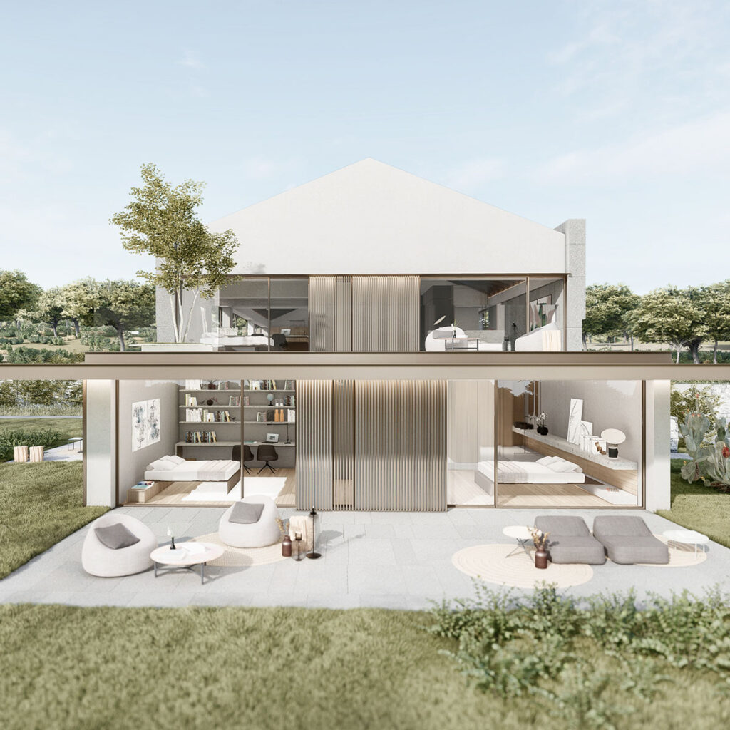 Nga jashtë, dizajni hapet drejt kopshtit dhe peizazhit të Etnës, duke krijuar një ndjenjë vazhdimësie midis arkitekturës dhe natyrës. Sipërfaqet me teksturë, tonet e ngrohta dhe përdorimi i drurit ndihmojnë në krijimin e një atmosfere shtëpiake intime dhe mikpritëse, e aftë të ndërveprojë me mjedisin përreth pa u përzier në sfond.