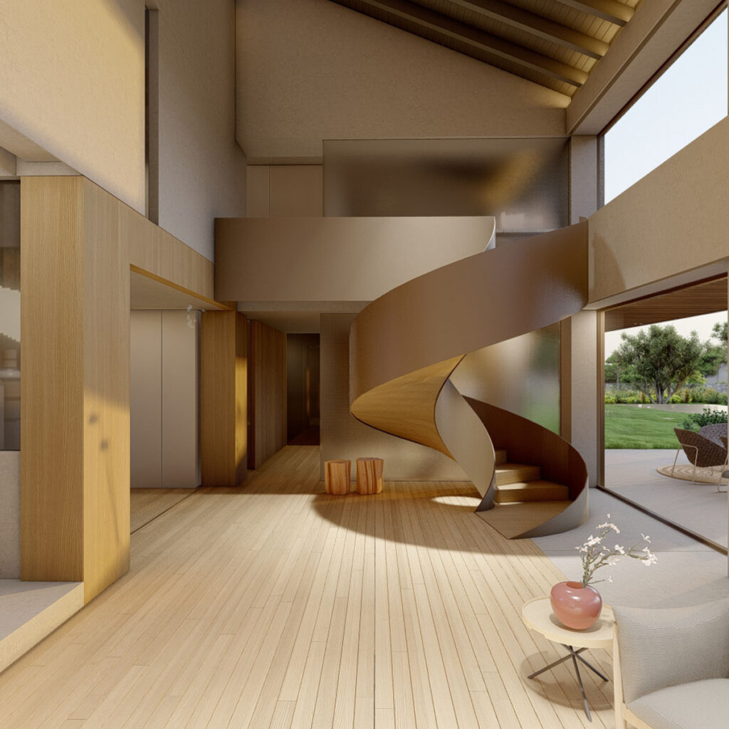 Lidhja midis katit të poshtëm dhe atij të sipërm sigurohet nga një shkallë, e cila bëhet një element skulpturor dhe shërben si nyja shpërndarëse dhe veçoria përcaktuese e projektit.